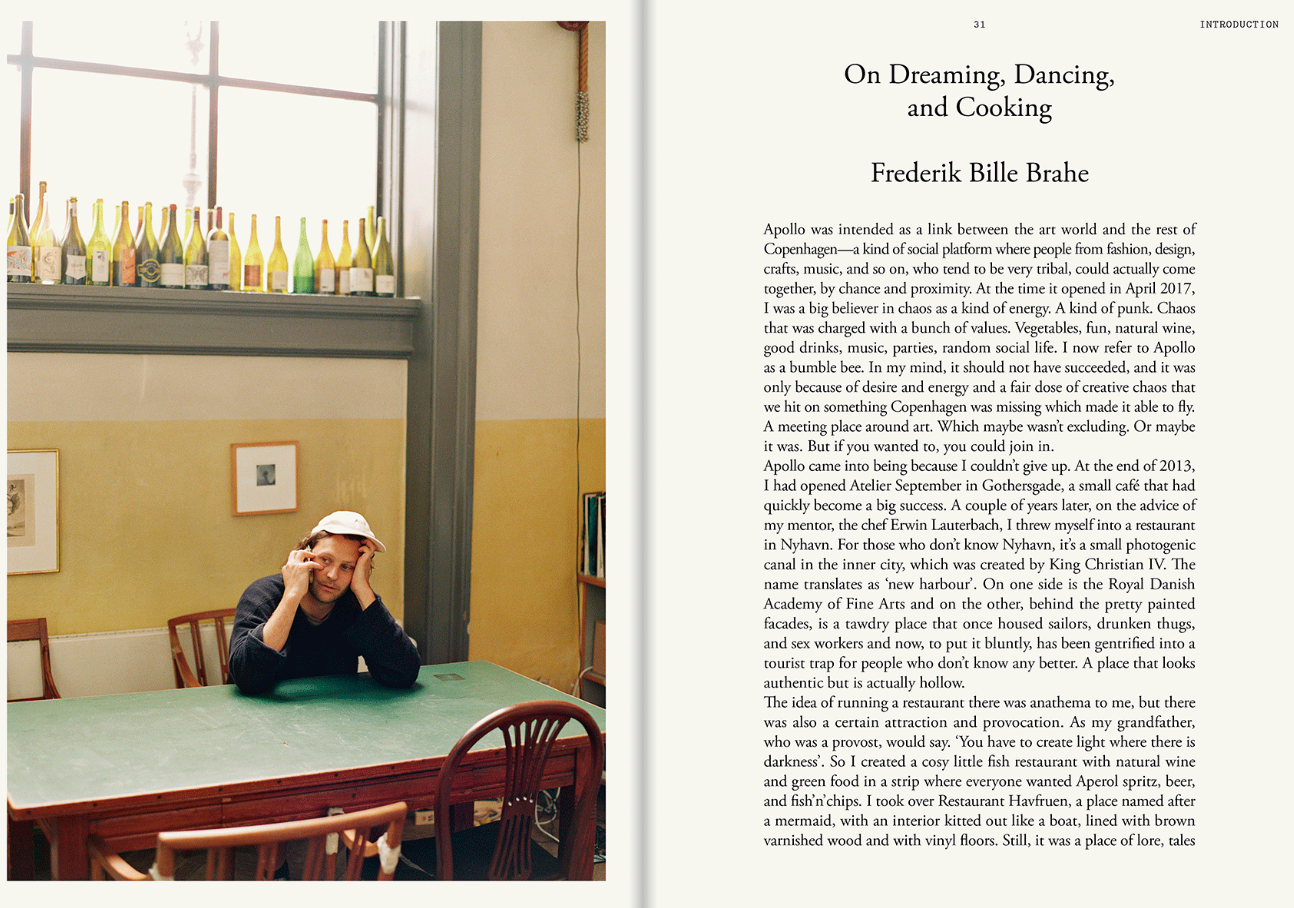 Frederik Bille Brahe is a Copenhagen-born fine-dining trained chef who worked in London and Paris before returning home to follow his dream of opening a very special small café where everyone is his guest. He opened Atelier September in Gothersgade in October 2013, expanding it to other locations in the Danish capital and using it as a launching pad for other ventures, including Apollo in the historic art space Kunsthal Charlottenborg and Sofi bakery in Berlin. His first collection of recipes, All the Stuff We Cooked, was an instant success, and his followup cookbook, Atelier September: A place for daytime cooking, blended recipes with an exclusive poetic chronicling of the first decade of Atelier September, as well as a documentation of his philosophy for gastronomy and life in general.