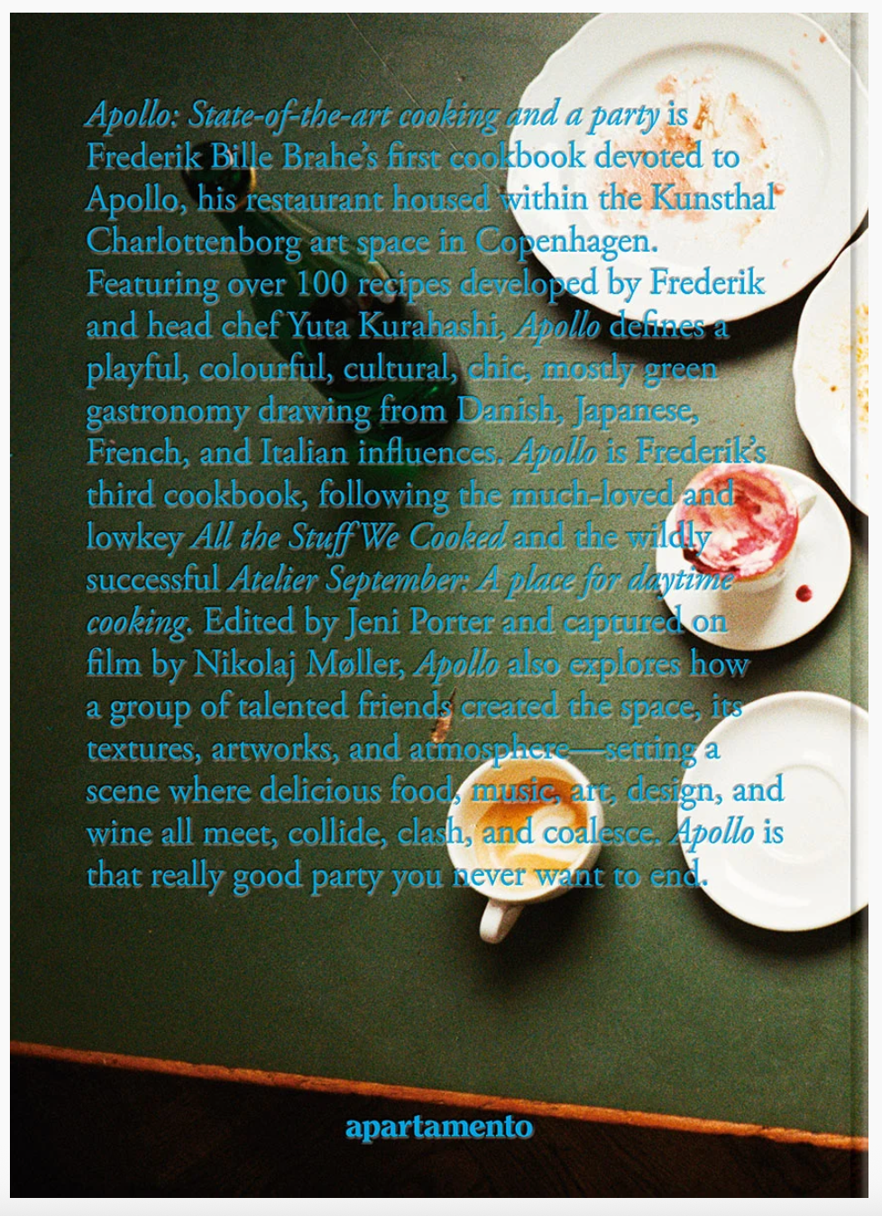 Apollo: State-of-the-art cooking and a party by Frederik Bille Brahe is the first cookbook devoted to Apollo, his museum restaurant located in the courtyard of the historical art institution Kunsthal Charlottenborg in Copenhagen. Together with head chef Yuta Kurahashi, Frederik shares 104 recipes in Apollo’s signature style: playful, elegant, and rooted in a dialogue between Danish cooking and Japanese, French, and Italian cuisines. With its colourful palette and defining sense of chic, green gastronomy, Apollo follows the much-loved and low-key All the Stuff We Cooked and the wildly successful Atelier September: A Place for Daytime Cooking. Perfect for dinner party cooking, this is Frederik at his most expressive and collaborative. Edited by Jeni Porter and captured on film by photographer Nikolaj Møller, Apollo also explores how a group of talented friends came together to create the space, its textures, artworks, and atmosphere—setting the scene for a restaurant where delicious food, friends, music, art, design, and wine all meet, collide, clash, and coalesce. Apollo is that really good party you never want to end.