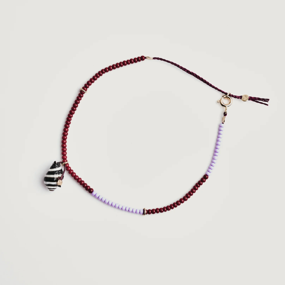The Mahogany anklet is a mix of beads and braid featuring a zebra stripe shell charm.