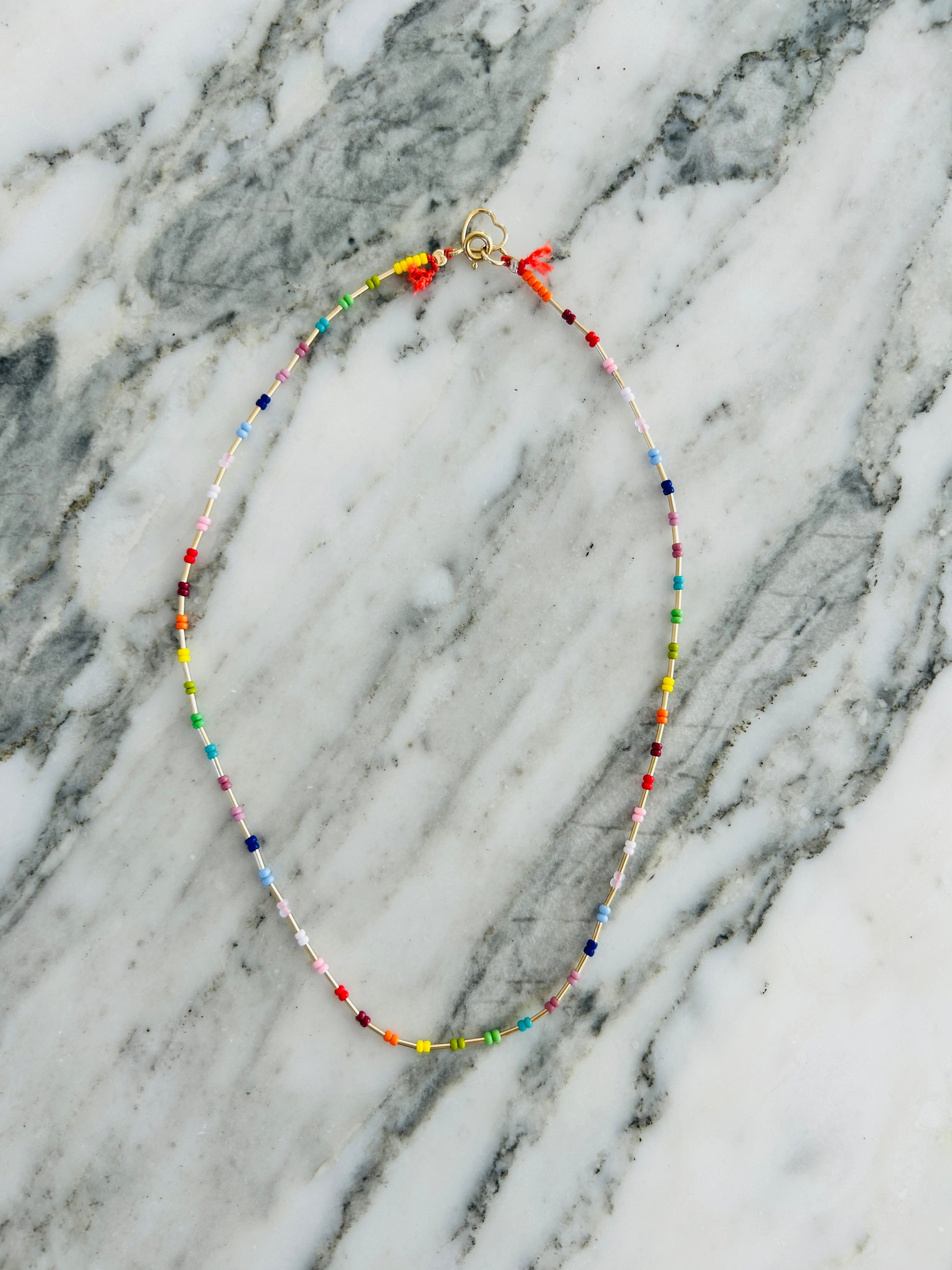 This love necklace is a rainbow of colour seed beads highlighted with 14kt gold filled tube beads, finished with a gold star.
