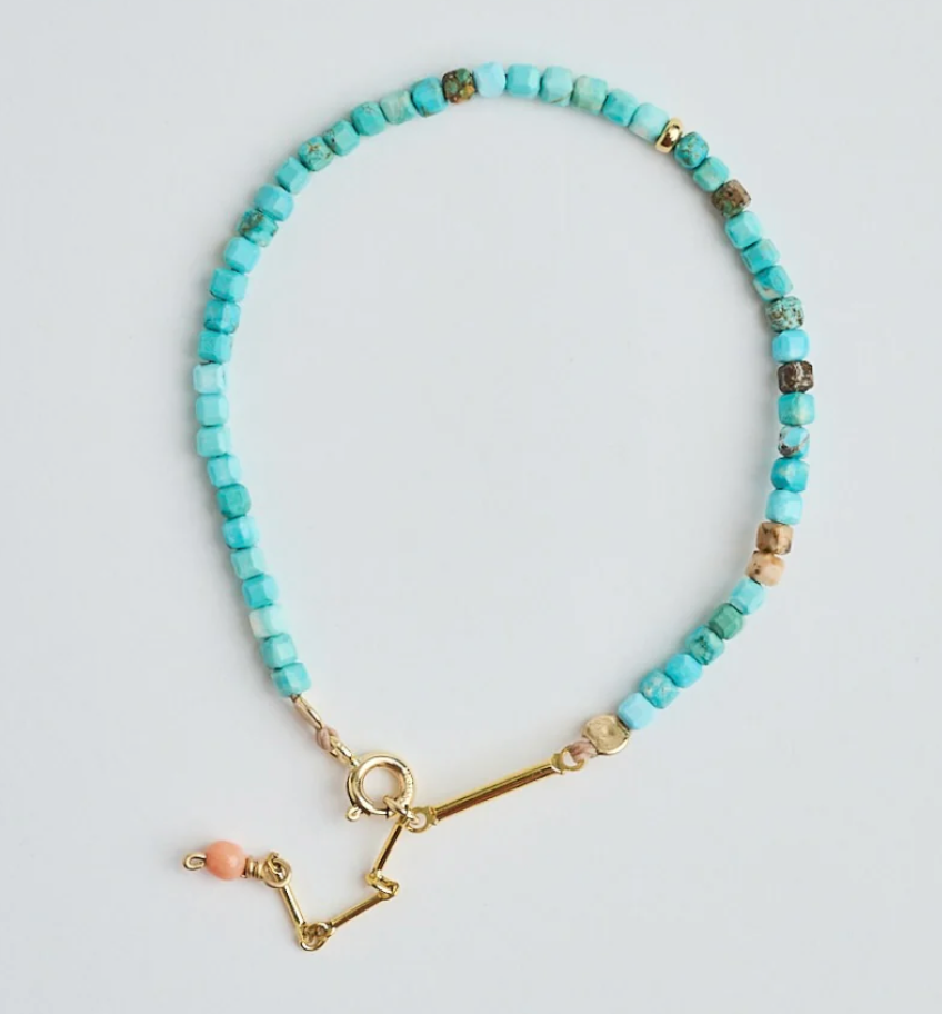 The Polly necklace is crafted with hand-selected turquoise beads in your choice of blue or green hues. Featuring a gold bar link chain closure. Perfect for layering or wearing alone.