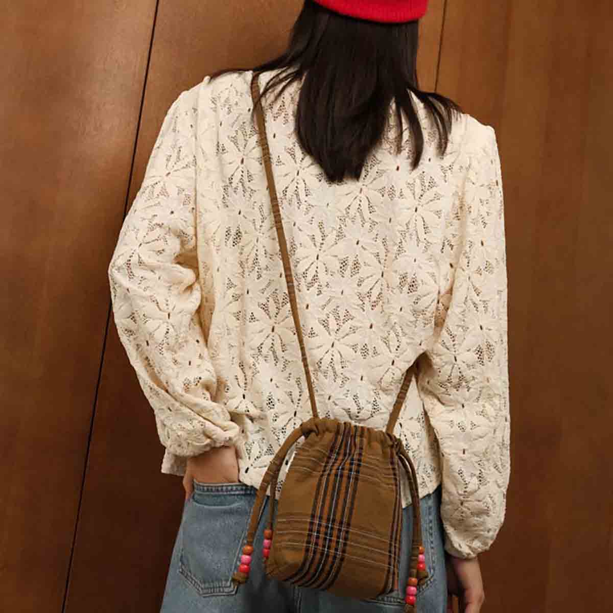 Its little extra: its ties with multicoloured pearls to close it!