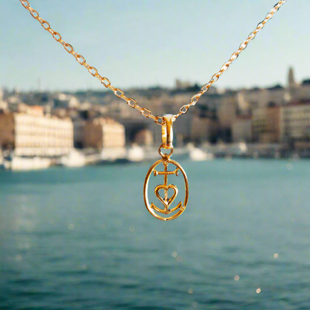The tridents at each end of the cross symbolise Faith, the fisherman with the anchor Hope and the heart Charity.