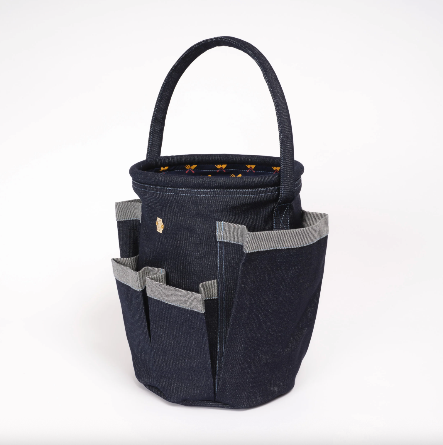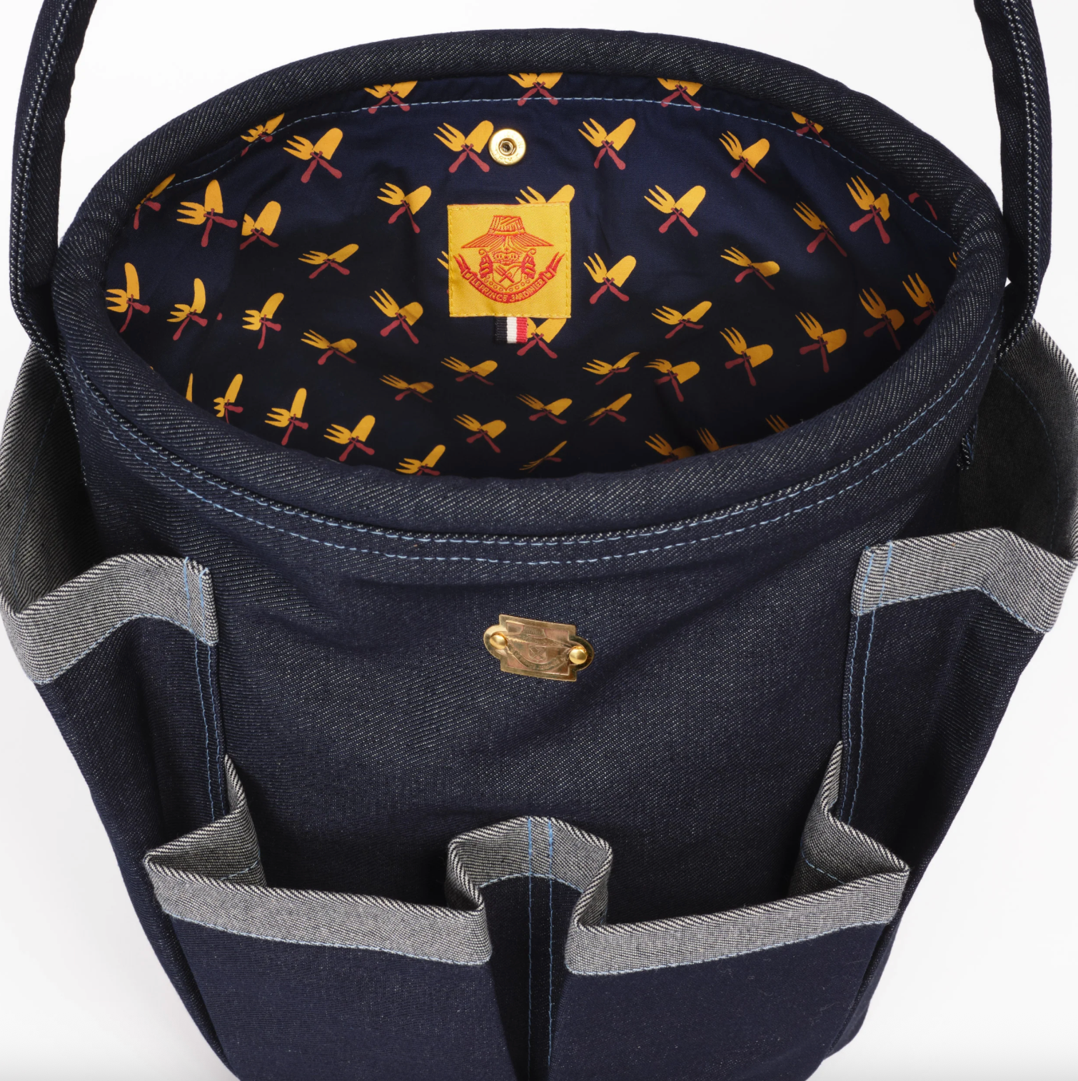 Denim bucket bag with 6 exterior pockets (4 small and two large), ideal for carrying gardening tools. Thanks to the handle, you can carry it as a handbag or shoulder bag. Its flexible but resistant material allows it to be folded and stored easily. Its blue lining features the Prince's tools. It closes with a snap button and the bottom is solidified.