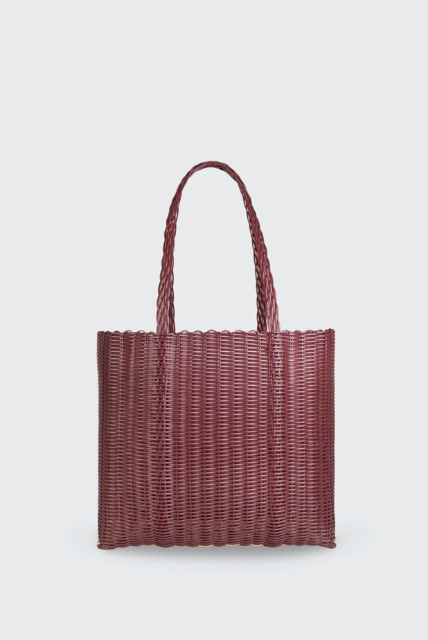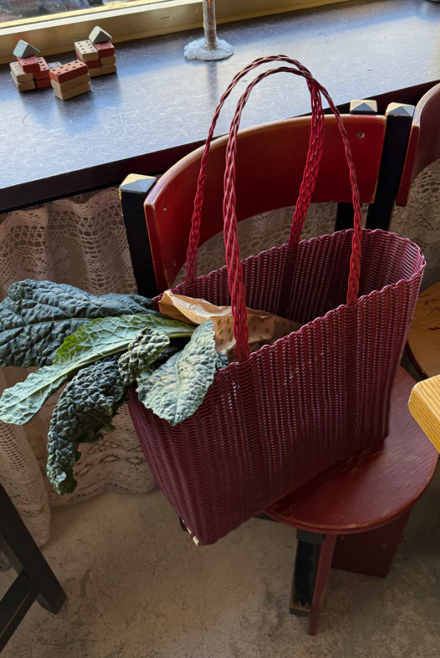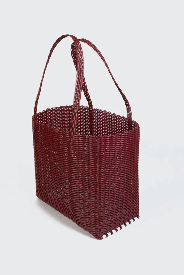 Rayas colourful basket bags are handmade in El Salvador by a small female-led team of skilled artisans. They are woven from 100% plastic (HDPE) strands, using a mix of virgin and post-consumer recycled material. HDPE stands for high density polyethylene and is one of the most widely recycled plastic polymers worldwide. This material makes our baskets waterproof, lightweight, UV resistant and extremely durable.