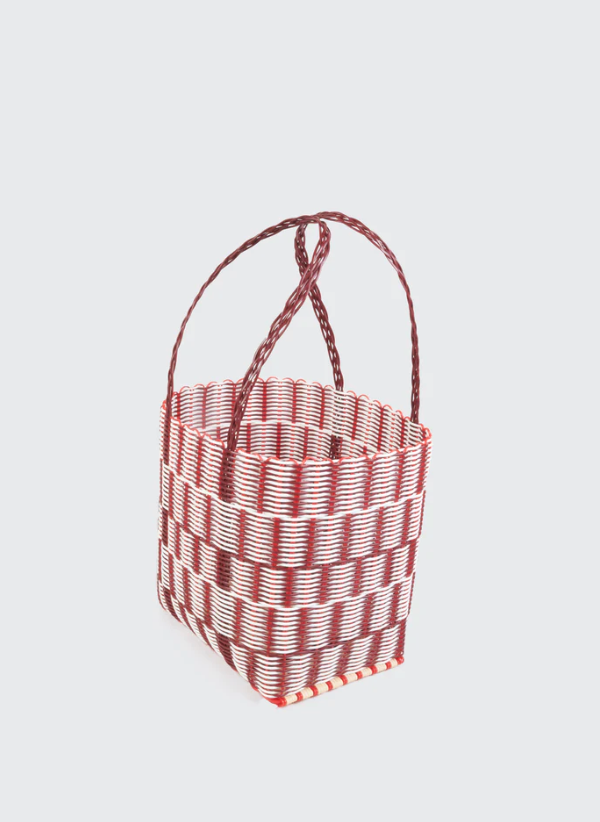 Rayas colourful basket bags are handmade in El Salvador by a small female-led team of skilled artisans. They are woven from 100% plastic (HDPE) strands, using a mix of virgin and post-consumer recycled material. HDPE stands for high density polyethylene and is one of the most widely recycled plastic polymers worldwide. This material makes our baskets waterproof, lightweight, UV resistant and extremely durable.