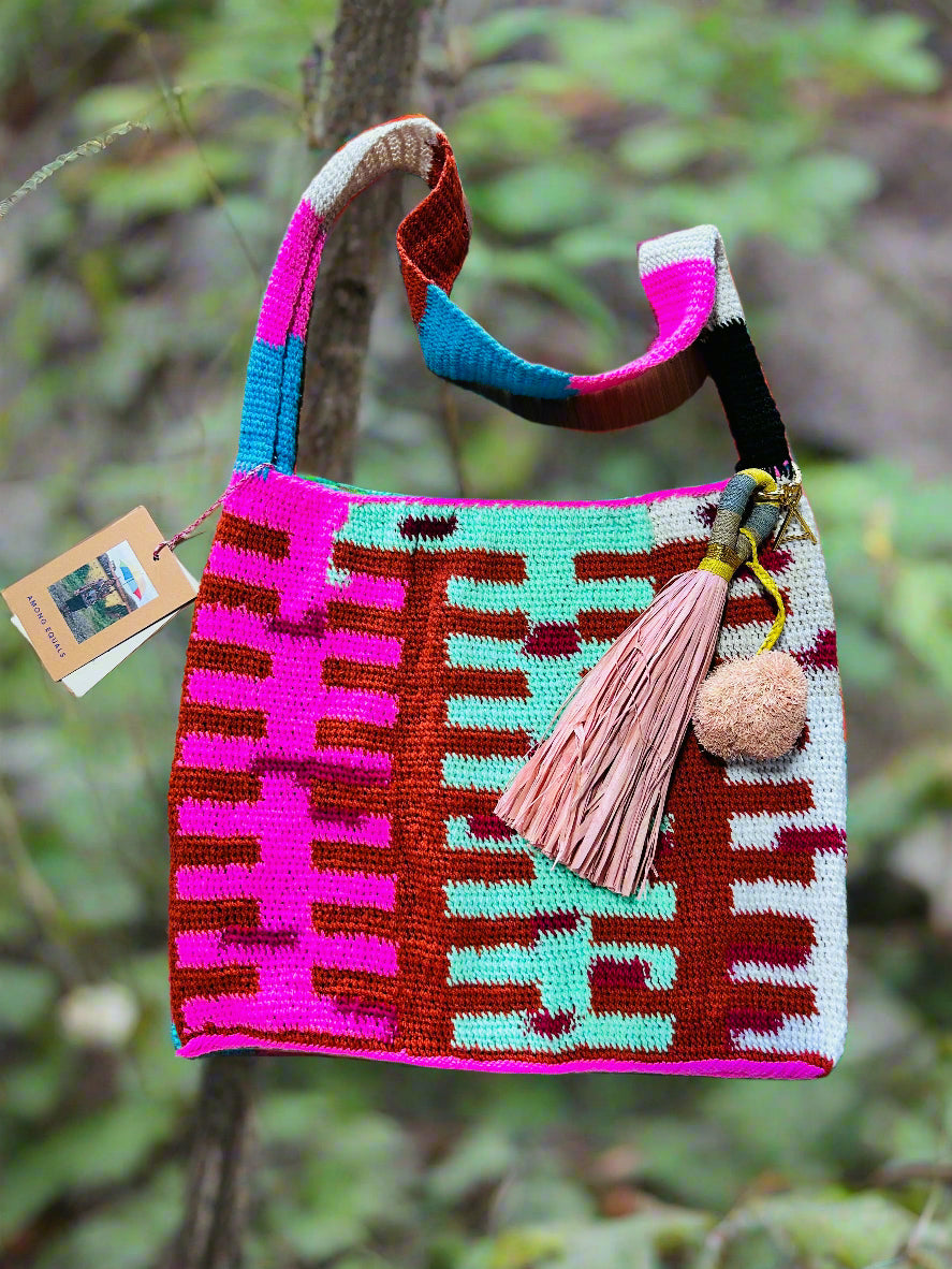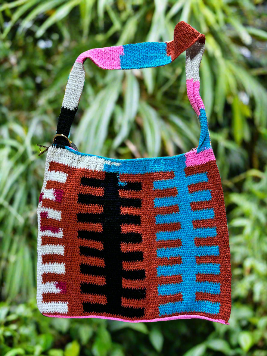 - This Bilum is handwoven from acrylic and wool yarn as well as upcycled knitwear using traditional weaving techniques.